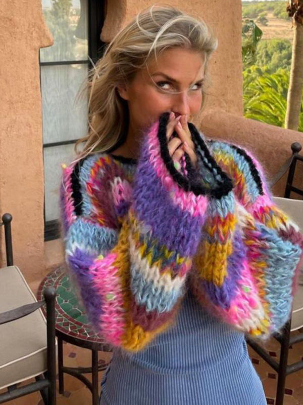 Striped long-sleeved sexy midriff-baring contrast color blouse sweater for women